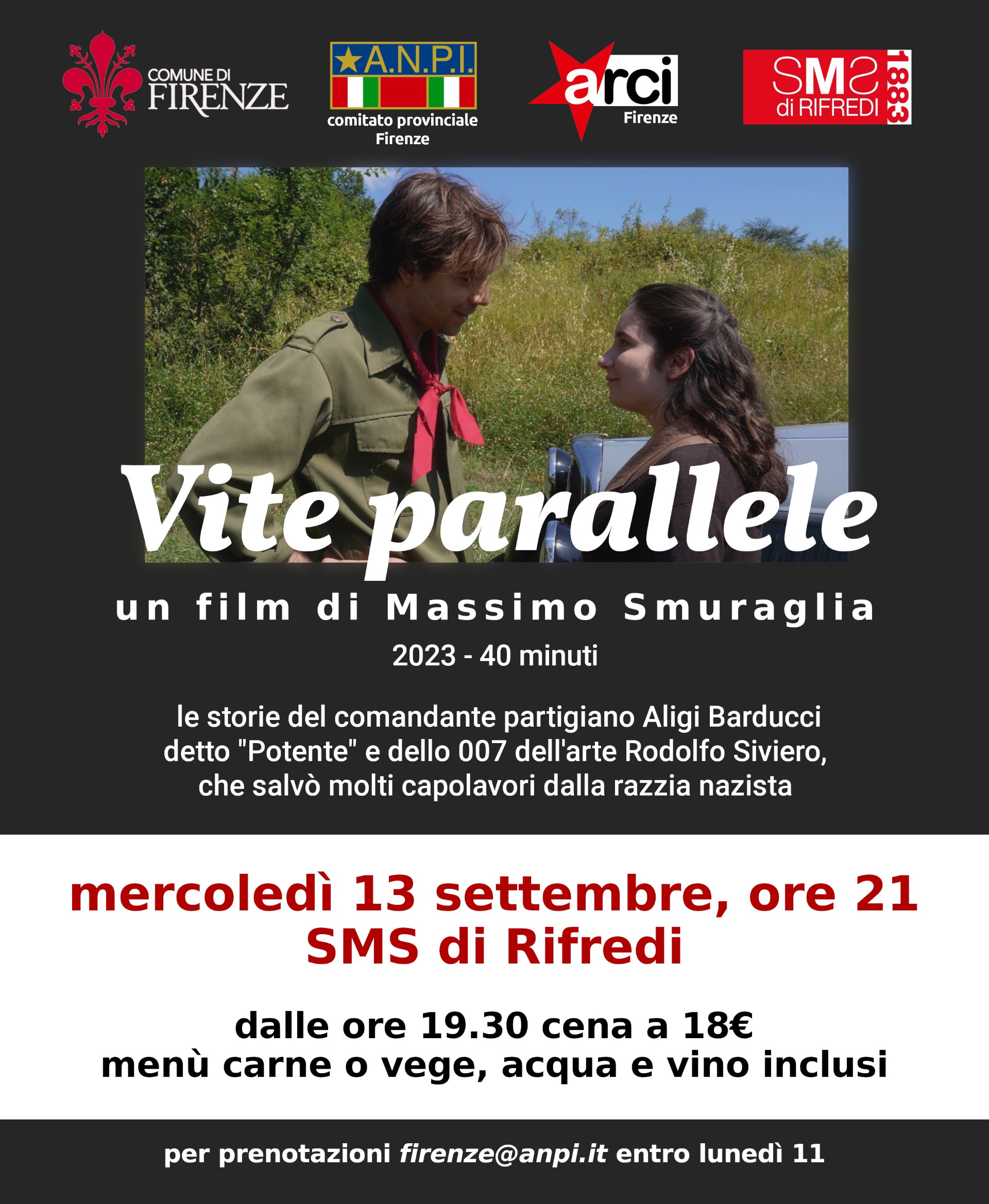 VITE PARALLELE - Si parte mercoledì 13 settembre all'Sms Di Rifredi a Firenze (Via Vittorio Emanuele II 303). Dopo la cena antifascista alle 19:30, verrà proiettato il film di Massimo Smuraglia "Vite parallele", incentrato sulle storie di Aligi Barducci, il comandante partigiano Potente, e di Rodolfo Siviero, lo 007 dell'arte, che salvò molti capolavori dalla razzìa nazista. La proiezione, ad ingresso gratuito, inizierà alle ore 21:00 e sarà dedicata alla memoria ed all'impegno del presidente onorario dell'Anpi Carlo Smuraglia, padre del regista stesso.