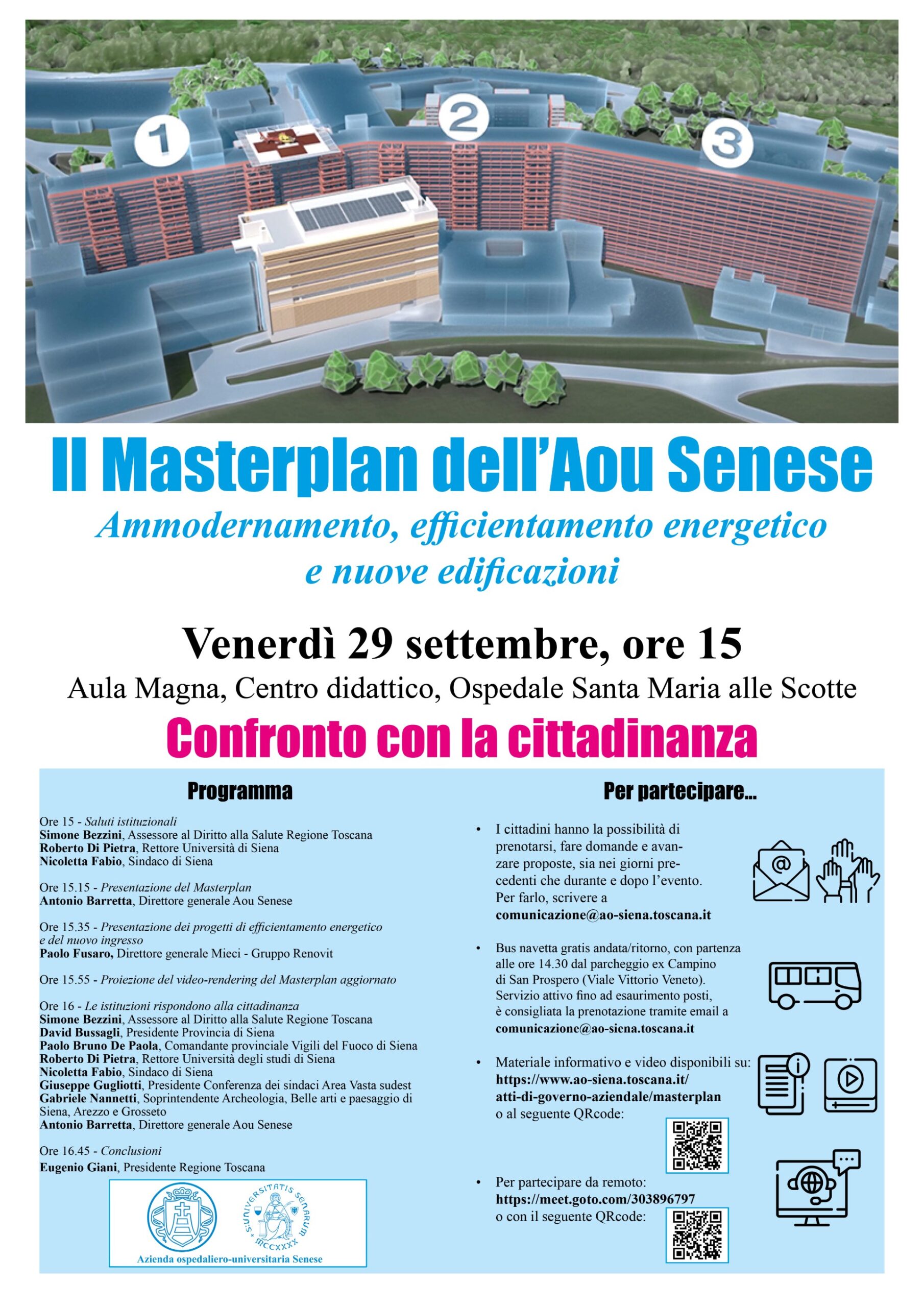 Partecipare all’iniziativa del 29 settembre è semplice. I cittadini hanno la possibilità di prenotarsi, fare domande e avanzare proposte, sia nei giorni precedenti che durante e dopo l’evento. Per farlo, basta scrivere a comunicazione@ao-siena.toscana.it inviando il proprio contributo: ai quesiti sarà data risposta dai referenti istituzionali presenti all'incontro. Allo stesso indirizzo è possibile prenotare un posto nel bus navetta che l’Aou Senese mette a disposizione gratuitamente per potersi recare in ospedale e assistere in presenza all’incontro. I mezzi partono alle ore 14.30 dal parcheggio ex Campino di San Prospero, in Viale Vittorio Veneto: servizio attivo fino a esaurimento posti, è consigliata la prenotazione. È inoltre possibile partecipare da remoto attraverso la piattaforma GoTo al link https://meet.goto.com/303896797. Materiale informativo, tra cui brochure e video/rendering dei progetti, già disponibili online sul sito dell’Azienda ospedaliero-universitaria Senese al link https://www.ao-siena.toscana.it/atti-di-governo-aziendale/masterplan.
