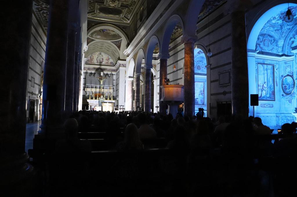 Il Duomo di San Miniato gremito di spettatori per assistere allo spettacolo teatrale “La Misericordia è degli inquieti”, organizzato dallo Misericordia di San Miniato in occasione del 400esimo anniversario della Diocesi, con il patrocinio del
