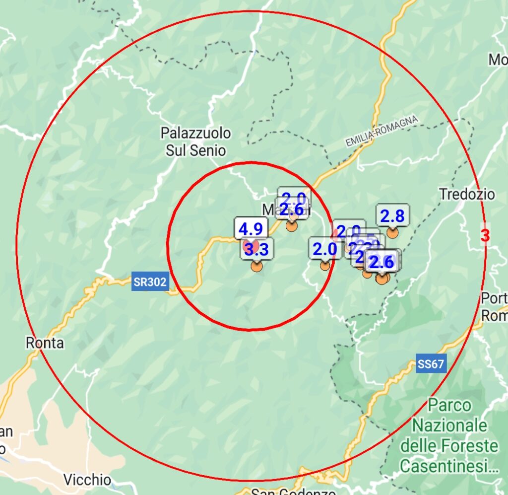 Intanto la terra continua a tremare. Come riporta l'Istituto nazionale di geofisica e vulcanologia, dopo la scossa delle 5.10 localizzata a 3 km a sud-ovest di Marradi, ce ne sono state circa altre dieci. La più forte alle 8.12, a 5 km da Marradi, con magnitudo 2.9: almeno cinque le scosse di assestamento alle ore 5 del mattino, tutte di magnitudo tra 2 e 2.6, registrate scosse anche a Tredozio (Forlì-Cesena). "Oltre 55 scosse registrate nella zona di Marradi, da quella più forte delle 5.10, uno sciame sismico ancora in corso" afferma il presidente Giani tramite social.