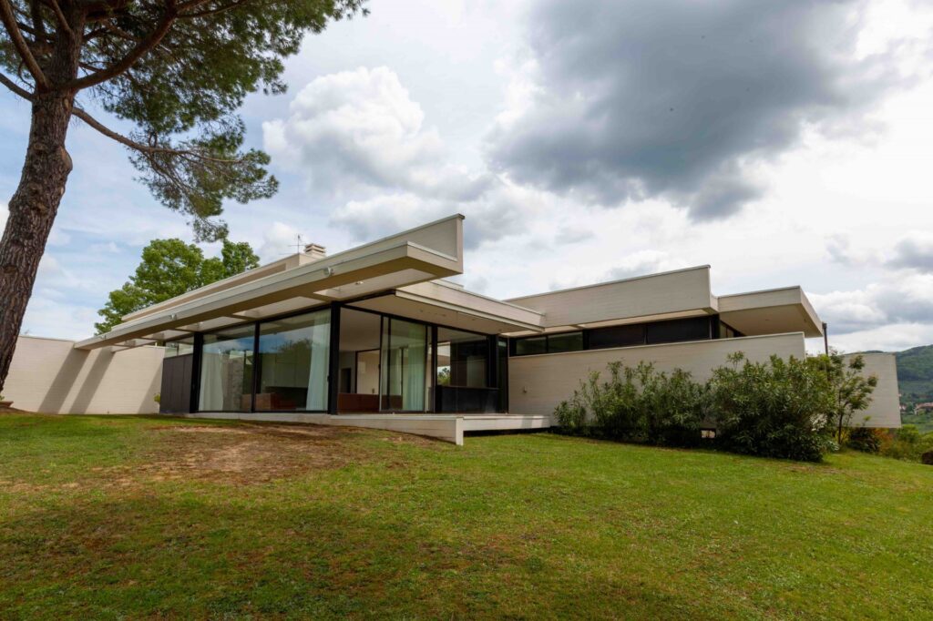 Dotata di 3 camere da letto e 4 bagni, per una superficie totale di 300 metri quadri, la villa è circondata da un parco privato di 7 ettari, con bosco e ulivi, ed un piccolo lago di quasi 1200 metri quadri. Dalle sue terrazze si può godere di una magnifica vista a 360 gradi sulle colline del Chianti, che conferiscono al panorama un aspetto morbido e sinuoso. L’edificio è stato costruito nel 1972 e presenta gli elementi tipici architettonici degli anni ’70, con struttura in cemento armato ed ampie vetrate dalle quali è possibile ammirare il giardino circostante e il panorama. Al piano superiore si trova l’ingresso, una cucina moderna e la sala da pranzo, collegati al piano inferiore tramite una scala rettilinea che si affaccia su un ampio cortile pavimentato con quadroni di cemento. Il piano inferiore è il cuore della vita domestica, con un soggiorno completamente vetrato, separato da un accogliente studio attraverso un muro con un camino. La zona notte comprende tre camere da letto, ciascuna caratterizzata da ampie vetrate che offrono viste panoramiche sul verde circostante, ampi armadi e bagni privati. La villa si trova precisamente a Strada in Chianti, a circa 20 km da Firenze, in un territorio che lega la sua tradizione al vino e all’enoturismo.