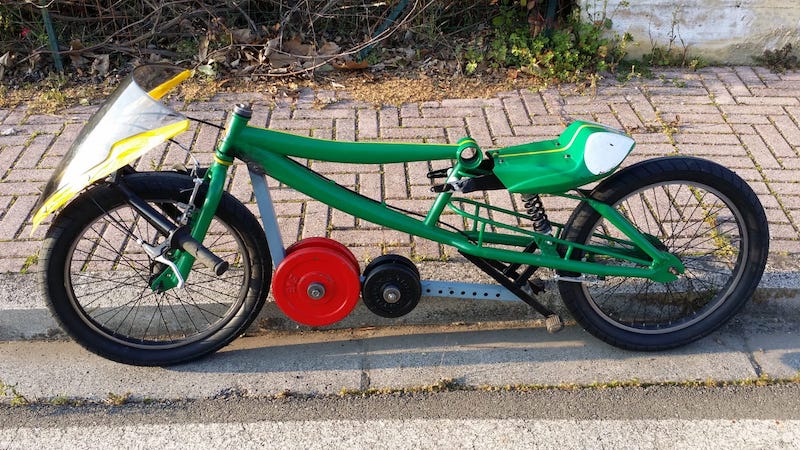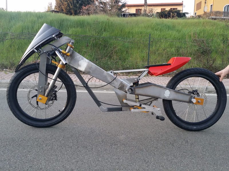 La prima volta costruimmo noi la gravity bike. Il modo più semplice per farlo è prendere una Bmx e ruotare il telaio di centottanta gradi, per poi aggiustarla a seconda della fisionomia. Adesso però la bici non la costruisco io, ma un amico, però io e mio padre la progettiamo al cento per cento, a partire dal singolo bullone.