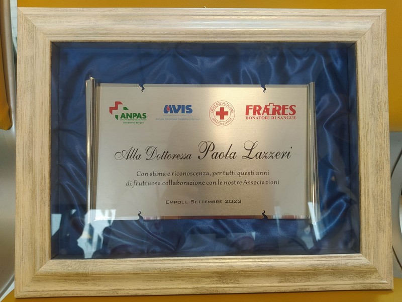 Stamani, presso il Centro trasfusionale dell'Ospedale di Empoli, i rappresentanti dell'Empolese-Valdelsa delle quattro Associazioni della donazione del sangue - ANPAS, AVIS, CRI e FRATRES - hanno conferito un riconoscimento alla dottoressa Paola Lazzeri, Responsabile del Servizio di Immunoematologia e Medicina Trasfusionale dell'Ospedale di Empoli, in occasione del suo pensionamento.