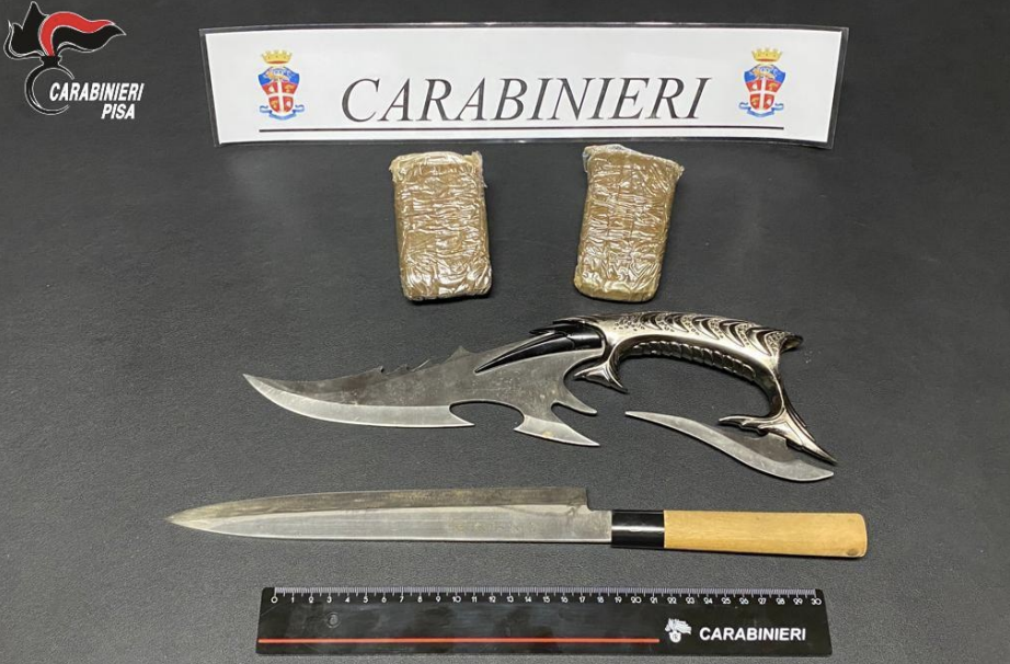 Il controllo dei militari ha portato alla luce due panetti di hashish di 200 grammi, un pugnale a doppia lama in acciaio della lunghezza di 36 centimetri e un coltello di 40 centimetri. Il tutto era nascosto in camera da letto. Il giovane è stato arrestato, andrà ai domiciliari.