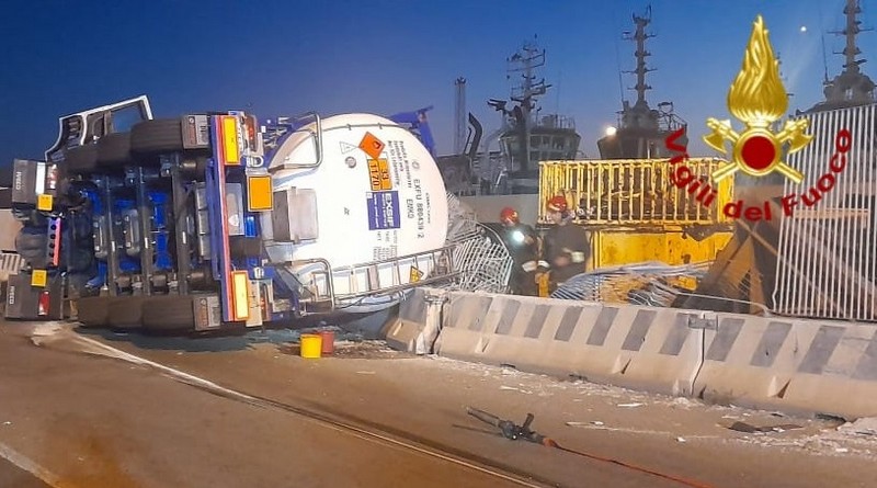 Intervento in corso da parte dei vigili del fuoco di Livorno in via Tintoretto, nell'area portuale dentro varco Valessini, a seguito di un incidente che in cui si è ribaltata una cisterna che trasportava 15mila litri di etanolo. L'incidente a causato lo sversamento di parte del contenuto trasportato nella cisterna.