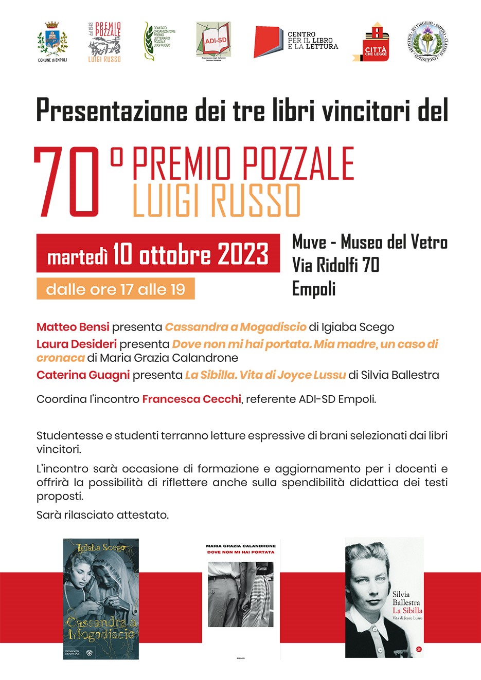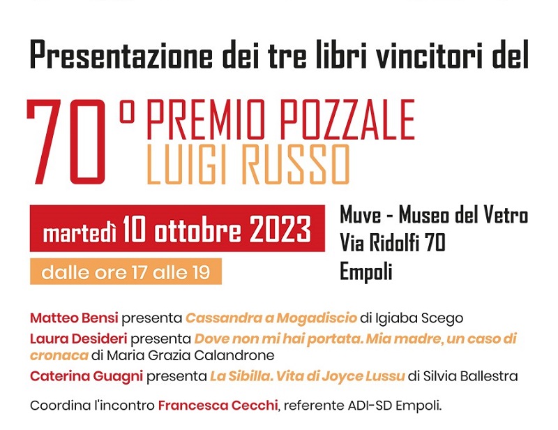 Il percorso di avvicinamento alla cerimonia di consegna del Premio Pozzale Luigi Russo 2023, in programma il 2 dicembre, entra nel vivo. E lo fa con un pomeriggio dedicato alla cultura e all'approfondimento che sarà ospitato al Museo del Vetro, in via Ridolfi 70, a Empoli. Questa la sede prescelta per ospitare la presentazione dei tre libri vincitori della 70esima edizione, "La Sibilla. Vita di Joyce Lussu" (Editori Laterza, 2022) di Silvia Ballestra, "Dove non mi hai mai portata. Mia madre, un caso di cronaca" (Einaudi, 2022) di Maria Grazia Calandrone e di "Cassandra a Mogadiscio" (Bompiani, 2023) di Igiaba Scego.L'iniziativa, nata dalla collaborazione dell’ADI-SD (Associazione degli Italianisti – sezione didattica) di Empoli e del Comitato organizzatore del Premio “Pozzale Luigi Russo”, si terrà martedì 10 ottobre 2023 alle ore 17, con ingresso libero. L'incontro sarà anche occasione di formazione e aggiornamento per i docenti, ai quali verrà consegnato un attestato di partecipazione, e offrirà la possibilità di riflettere sulla spendibilità didattica dei testi proposti.Entrando nel dettaglio dell'incontro, coordinato da Francesca Cecchi, referente ADI - SD Empoli, a presentare il libro "Cassandra a Mogadiscio" di Igiaba Scego sarà Matteo Bensi, mentre Laura Desideri darà voce a "Dove non mi hai portata. Mia madre, un caso di cronaca" di Maria Grazia Calandrone. Sarà infine Caterina Guagni a presentare "La Sibilla. Vita di Joyce Lussu" di Silvia Ballestra. Ad arricchire il pomeriggio di ascolto e condivisione, le letture espressive di brani selezionati dai libri protagonisti a cura di studentesse e studenti.Un'occasione dunque da cogliere da parte di tutti coloro che vogliano conoscere meglio libri e autori vincitori del Premio Pozzale Luigi Russo 2023. Chi vuole dire la sua sui testi può ancora farlo attraverso la Giuria popolare del Premio. Fino al 19 novembre 2023 lettrici e lettori possono votare per assegnare la menzione speciale ‘Selezione dei lettori’ che sarà consegnata all'autrice vincitrice in occasione della cerimonia di premiazione. Per votare il proprio libro preferito fra i tre vincitori, basta indicare la propria preferenza sul sito web del Premio Pozzale, www.premiopozzale.it. In questo percorso hanno un ruolo importante anche le tre librerie cittadine, 'amiche' del Premio Pozzale: NessunDove (piazza Farinata degli Uberti, 18), Rinascita (via Ridolfi 53 e Centro*Empoli, via Sanzio 199) e La San Paolo Libri & Persone (via del Giglio 53) promuovono e sostengono la lettura dei tre libri vincitori e la partecipazione alla Giuria popolare, con uno sconto immediato sull’acquisto dei libri vincitori del premio e un gadget omaggio ai partecipanti alla giuria popolare. Chi voterà il proprio libro preferito tramite il sito del Premio riceverà per mail un coupon da presentare nelle librerie, che darà diritto a ricevere l’omaggio. E chi vuole esprimere la propria preferenza può farlo anche direttamente nelle librerie cittadine, oltreché recandosi alla biblioteca comunale "Renato Fucini" in via Cavour 36.