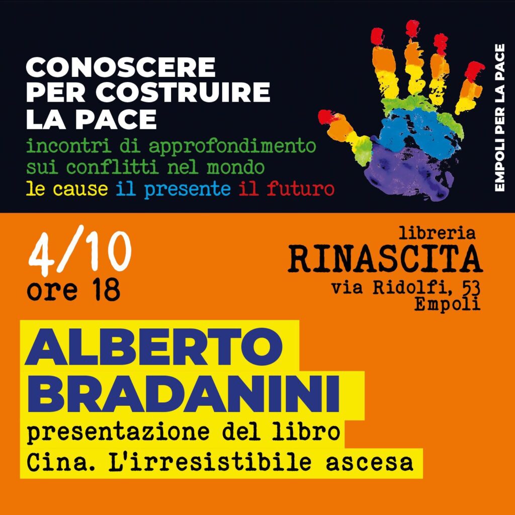 Dopo Raniero La Valle, sarà Alberto Bradanini l’ospite della nuova iniziativa del comitato Empoli per la Pace. L’appuntamento è per mercoledì 4 ottobre alle 18 alla libreria Rinascita, lo spunto per la discussione è la presentazione del libro ‘Cina, l’irresistibile ascesa’, volume nel quale l’autore abbraccia l’evolversi della Repubblica Popolare sin dalla sua nascita nel 1949.