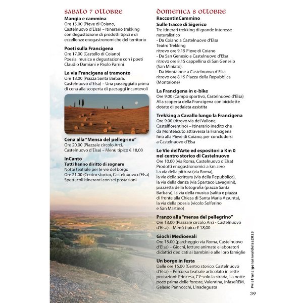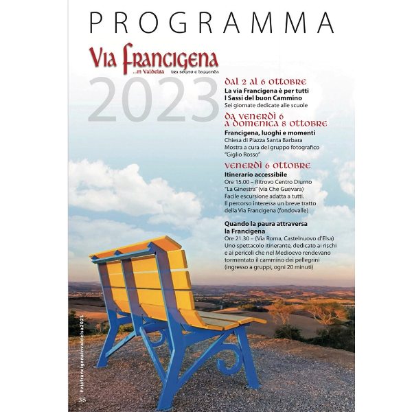 Avvio della festa venerdì 6 ottobre (ore 21.30) nel borgo collinare di Castelnuovo d’Elsa (dove si tengono molte delle iniziative in programma) con lo spettacolo itinerante "Quando la paura attraversa la Francigena", percorso inquietante articolato su sei postazioni, dove tra briganti, appestati, spiriti e molto altro si potrà avere un’idea dei rischi e ai pericoli che nel Medioevo rendevano alquanto tormentato il cammino dei pellegrini. Sabato 7 ottobre (ritrovo ore 14.00) il primo percorso a piedi con "Mangia e cammina", con due soste presso alcune aziende agricole del territorio. Due ore dopo (ore 16.00) inaugurazione della "Big Bench" e alle ore 17.00 appuntamento al Castello di Coiano con i "Poeti sulla Francigena", un pomeriggio speciale con Claudio Damiani e Paolo Parini accompagnato da musica e degustazione, in collaborazione con gli studenti dell’Enriques. In serata trekking al tramonto (ore 18.00) e alle 20.00 cena alla "Mensa del Pellegrino" (Circolo Arci Castelnuovo d’Elsa). Nel dopocena, a Castelnuovo d’Elsa, notte teatrale con "InCanto. Tutti hanno diritto di sognare", percorso teatrale articolato in sei postazioni a tema, tra sogno, amore, fragilità, speranza, riscatto.
