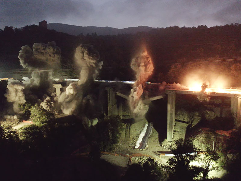 Le operazioni di brillamento, coordinate da Amplia società del Gruppo Aspi e prima azienda di costruzioni per attività a livello nazionale, sono state precedute da fasi di demolizione meccanica di piccole parti dell’opera, finalizzate anche al posizionamento del materiale esplosivo in punti strategici individuati con l’obiettivo di garantire la demolizione in massima sicurezza dell’impalcato ma anche la salvaguardia delle sottostrutture.