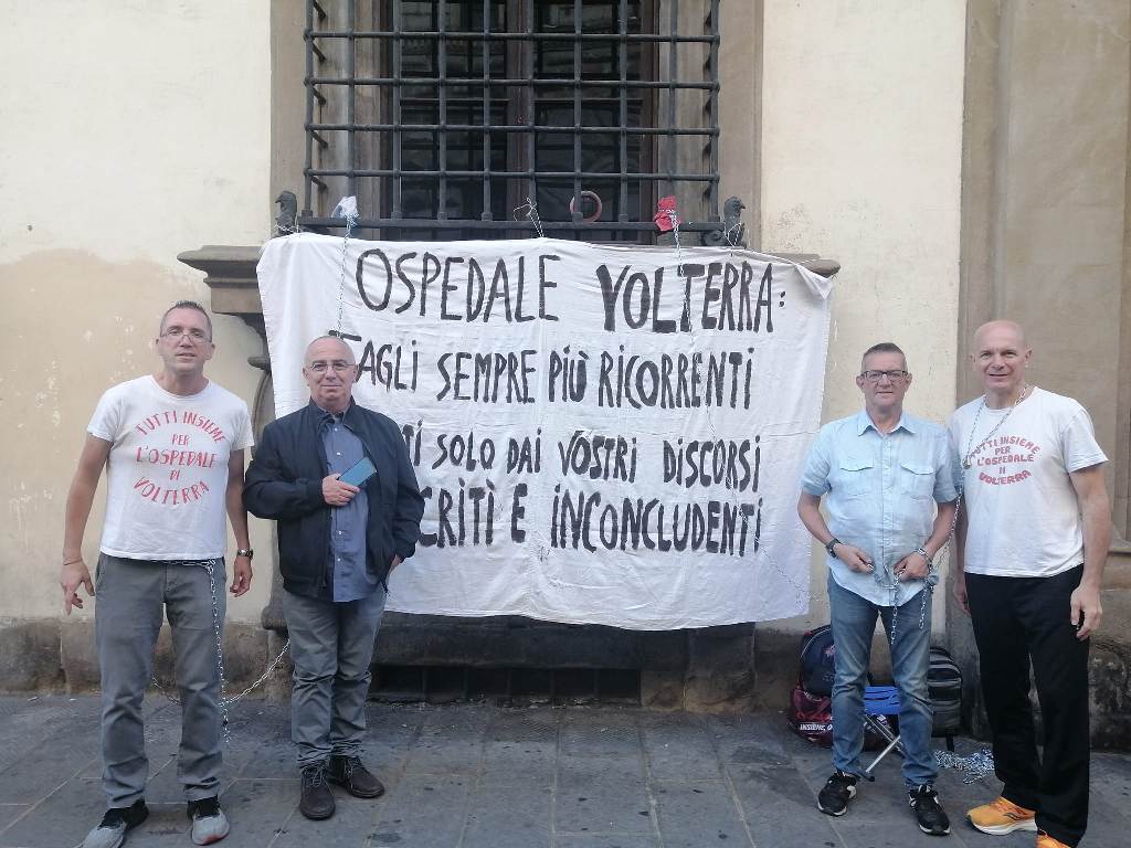 La protesta continua. A distanza di anni, alcuni operatori sanitari della Valdicecina sono tornati alla massima forma di protesta per salvare l'ospedale di Volterra. Stavolta si sono incatenati alle inferriate del palazzo della Regione Toscana, per proteggere i pochi servizi rimasti nel nosocomio dell'area interna. Tra di loro c'è un volto noto: Marco Buselli, sindaco per 10 anni della città etrusca. Con la fascia tricolore aveva inscenato una protesta sulla Torre del Palazzo dei Priori per gli stessi motivi di questi giorni. Nel frattempo, in attesa di un incontro chiarificatore, molti consiglieri regionali hanno fatto visita al presidio: da Fdi alla Lega fino al M5S.