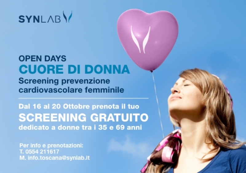Inoltre, SYNLAB propone uno screening gratuito volto alla prevenzione del rischio cardiovascolare, che consiste in un approfondimento clinico per pazienti a rischio tramite visita specialistica cardiologica ed esecuzione elettrocardiogramma, presso i Medical Center in Toscana di Via Meucci 4 Bagno a Ripoli (ex CMT), Via della Madonna 30 Pistoia, Via Livornese 169 Lastra a Signa, Via dei Turri 29 Scandicci, Via della Repubblica 21/B Piombino, Via Aurelia Sud 23 Pietrasanta, Firenze in Via Cimabue 31-35 e Viale De Amicis 87, Via della Querciola 12 Sesto Fiorentino.