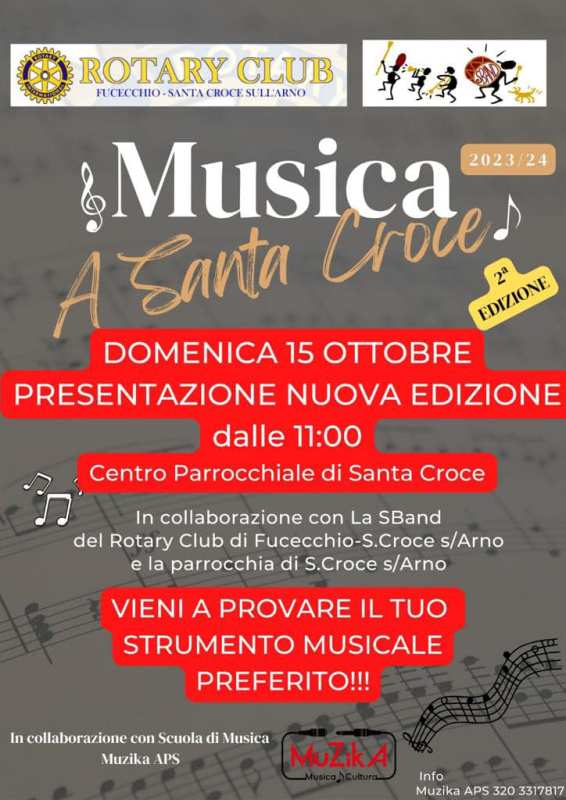 Domenica 15 ottobre 2023 la presidente del Rotary club di Fucecchio Santa Croce sull'Arno, Maria Elena Maffei, ha presentato, presso il Centro Parrocchiale di Santa Croce sull’Arno, il progetto "Musica a Santa Croce", realizzato con la collaborazione di Muzika APS, della Chiesa Collegiata di Santa Croce sull'Arno e della Sband del Rotary club di Fucecchio Santa Croce sull'Arno, alla sua seconda edizione.
