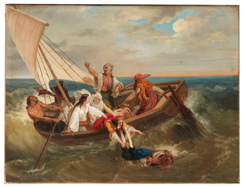 Il dipinto di Hayez raffigurante la Barca con i Greci fuggitivi dalla strage di Sciò, si ispira ad un evento realmente accaduto: il massacro di massa da parte dell’esercito ottomano della popolazione greca di Parga sull’isola di Sciò il 12 aprile 1822, e la conseguente fuga per mare dei superstiti greci. L’episodio aveva suscitato al tempo un notevole impatto emotivo nell’occidente europeo dando origine ad un genere pittorico e letterario chiamato “filoellenismo”, che celebrava la lotta del popolo greco contro gli invasori ottomani. Il tema era particolarmente caro anche ad Hayez, che realizzò una serie di dipinti di questo soggetto, poiché attraverso di esso poteva esprimere con grande forza sentimentale l’amor di patria che avrebbe dovuto ispirare il Risorgimento italiano.