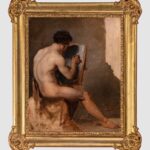 Il nudo accademico in atto di disegnare, che porta la firma dell’artista in basso a sinistra, unisce in una sola figura i due ruoli costitutivi della seduta accademica, ovvero quello di posare nudo e quello di disegnare il corpo umano. L’opera, eseguita dall’artista nel suo periodo romano ((1809-1817) si accosta a uno studio virile del 1812 che rappresenta forse lo stesso modello.