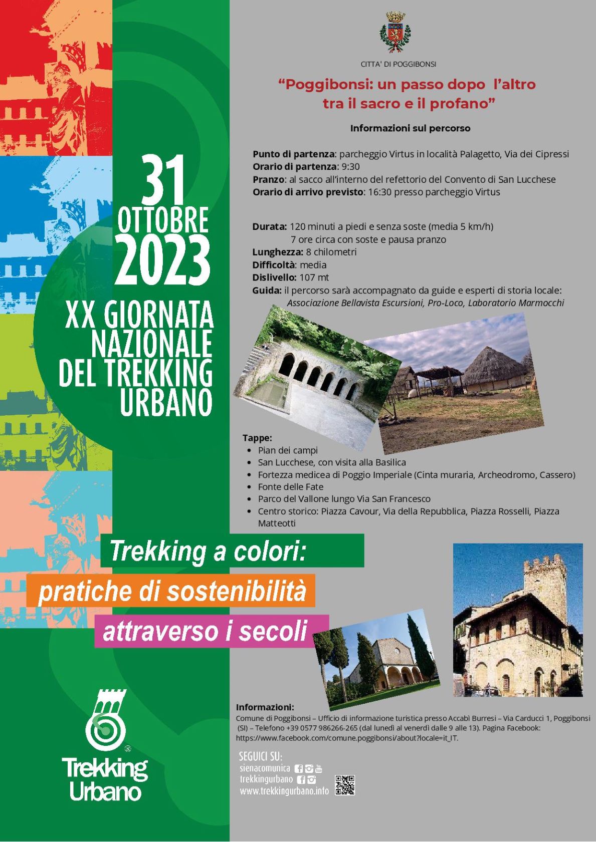 I dettagli dell’evento “Poggibonsi: un passo dopo l’altro tra il sacro e il profano"Punto di partenza: parcheggio Virtus in località Palagetto, Via dei CipressiOrario di partenza: 9:30Pranzo: al sacco all’interno del refettorio del Convento di San LuccheseOrario di arrivo previsto: 16:30 presso parcheggio VirtusDurata: 120 minuti a piedi e senza soste (media 5 km/h), 7 ore circa con soste e pausa pranzoLunghezza: 8 chilometriDifficoltà: mediaDislivello: 107 mtGuida: il percorso sarà accompagnato da guide e esperti di storia locale: Associazione Bellavista Escursioni, Pro-Loco, Laboratorio MarmocchiTappePian dei campi, San Lucchese, con visita alla Basilica, Fortezza medicea di PoggioImperiale (Cinta muraria, Archeodromo, Cassero), Fonte delle Fate, Parco del Vallone lungo Via San Francesco, centro storico (piazza Cavour, via della Repubblica, piazza Rosselli, piazza Matteotti)La Giornata Nazionale del Trekking Urbano è una manifestazione ideata nel 2002 dal Comune di Siena, in collaborazione con l’Associazione Nazionale Guide Turistiche. Quest’anno compie 20 anni ed è dedicata a “Trekking a colori: pratiche di sostenibilità attraverso i secoli” Coinvolge 101 città e borghi d’Italia e si svolge nel segno della sostenibilità. Decine gli appuntamenti in programma martedì 31 ottobre in grado di connettere simbolicamente 101 comuni della penisola in un ideale itinerario green lungo centinaia di km: da nord a sud, da est a ovest, attraverso grandi città e piccoli borghi ricchi di storia, fascino e cultura. Info: www.trekkingurbano.info