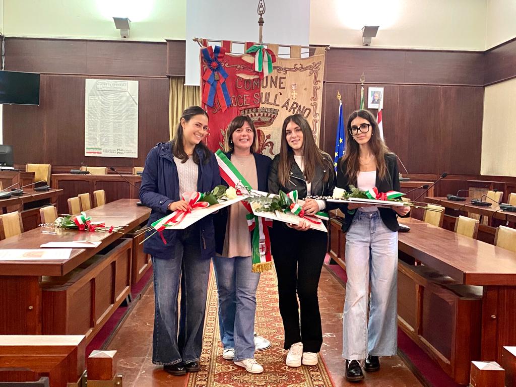 Sono studentesse eccellenti, diplomate con il massimo dei voti. Quattro ragazze di Santa Croce sull'Arno sono state premiate dalla sindaca Giulia Deidda per aver conseguito la Maturità nell'anno scolastico 2022-23 con voto 100 o 1o0 e lode. La cerimonia si è svolta ieri nella sala del Consiglio comunale del Municipio: alle studentesse Siria Di Sandro del liceo scientifico Marconi San Miniato, Serena Frisullo dell'Ipsia Pacinotti di Pontedera (diplomata con lode), Rosilda Gjana dell'Its Cattaneo di San Miniato e Giada Sestini del Liceo scientifico Marconi di San Miniato (diplomata con lode) sono state consegnati una pergamena e un omaggio floreale.