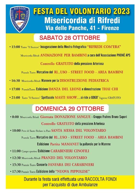 L’apertura della festa sabato pomeriggio alle 15 vedrà l’inaugurazione della mostra fotografica "Rifredi com’era", l’animazione per i bambini e il Mercatino del Ri…Uso: sono previsti anche momenti informativi e di controllo per i cittadini con i check gratuiti della pressione arteriosa e le isole di soccorso che affronteranno il tema della disostruzione pediatrica. Gli spettacoli e gli appuntamenti andranno poi avanti fino a tarda serata per proseguire poi anche nella giornata successiva. Domenica mattina alle 10 sarà celebrata la Santa Messa del Volontario nella Pieve di Santo Stefano in Pane con i confratelli e consorelle della Misericordia che si ritroveranno nella sede prima della celebrazione per indossare la tradizionale cappa. Domenica mattina inoltre sarà possibile effettuare la donazione del sangue grazie all’impegno del Gruppo Fratres Bruno Sapori (prenotazione al numero 055 4269215) e assistere all’esibizione dei Carabinieri cinofili. Alle 12:30 è in programma il Pranzo del Volontario a cui seguiranno ancora molte proposte per grandi e piccoli tra le quali il concerto della Fanfara dei Carabiniere e l'esibizione della "Nuova Pippolese". Programma dettagliato disponibile sul sito www.misericordiarifredi.it
