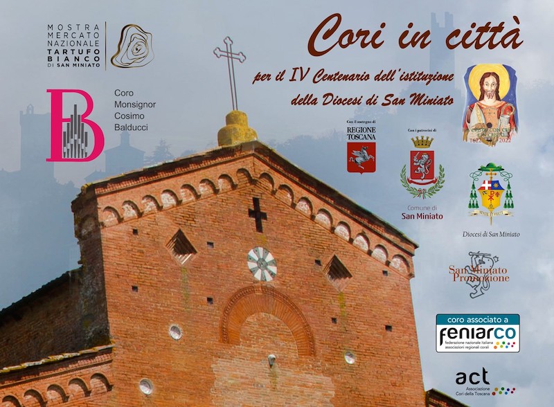 Domenica 12 novembre, a San Miniato, la diciassettesima edizione della rassegna di musica sacra dal titolo “Cori in città”, promossa dal Coro «Monsignor Cosimo Balducci» nell’ambito della 52ª Mostra-Mercato Nazionale del Tartufo Bianco di San Miniato e organizzata quest'anno anche per onorare il IV Centenario dell’istituzione della Diocesi di San Miniato, in adesione al progetto “Le Associazioni culturali di San Miniato per il Giubileo della Diocesi”, sotto il coordinamento della Fondazione San Miniato Promozione.