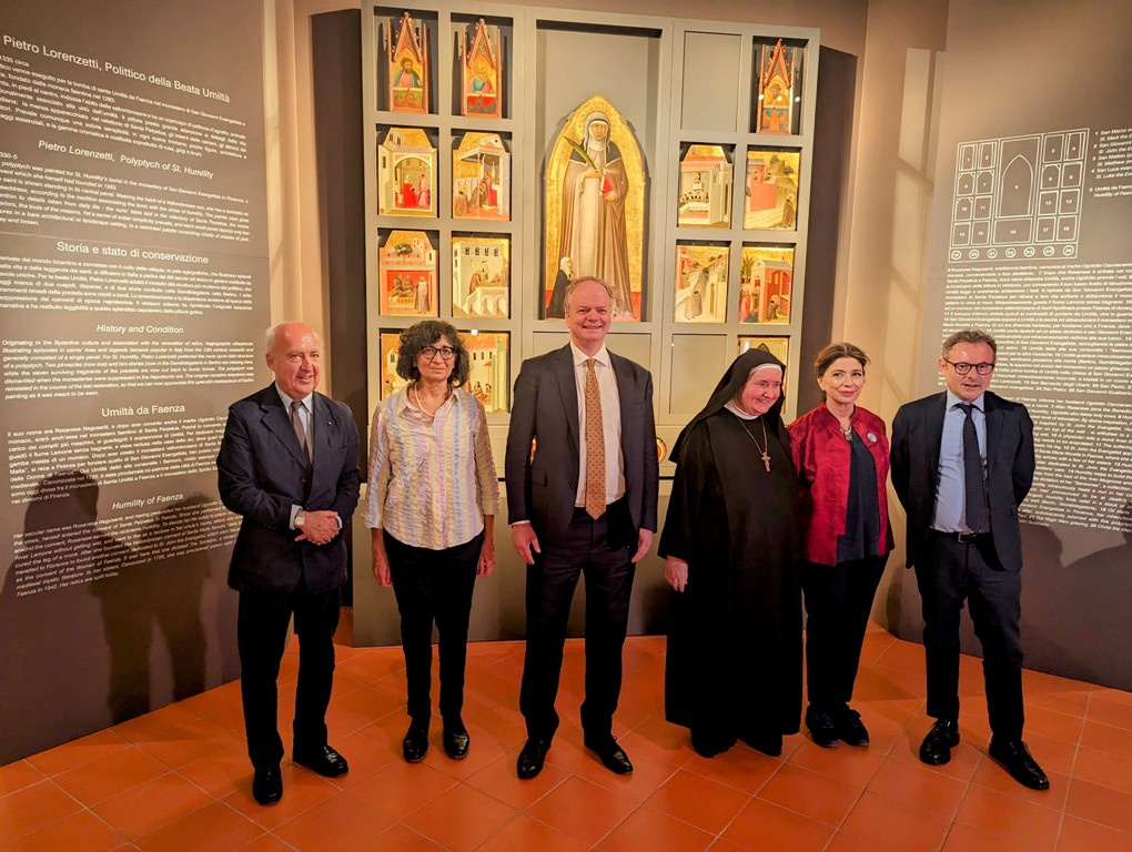 Il sindaco di Faenza Massimo Isola: “È con grande emozione che vediamo oggi risplendere in Pinacoteca il polittico di Pietro Lorenzetti con le Storie di Santa Umiltà. E l’emozione non è solo quella estetica che si prova davanti a un’opera meravigliosa, ma ha un carattere squisitamente faentino: tutti i dipinti del registro superiore, infatti, raffigurano storie legate alla nostra città, immaginata tra le sue mura medievali. Uno di essi ci mostra addirittura questa donna meravigliosa che si incammina verso Firenze guadando il Lamone, il fiume che porta vita a Faenza e al suo territorio ma che anche in tempi recentissimi è stato causa di devastazione. La mostra è dunque motivo di riflessione per tutti noi faentini, ma non solo: è uno spunto per pensare a Faenza con orgoglio, perché i dipinti del polittico degli Uffizi ci invitano a considerare il ruolo importantissimo della nostra città nella storia, nell’arte e nella cultura italiane”.
