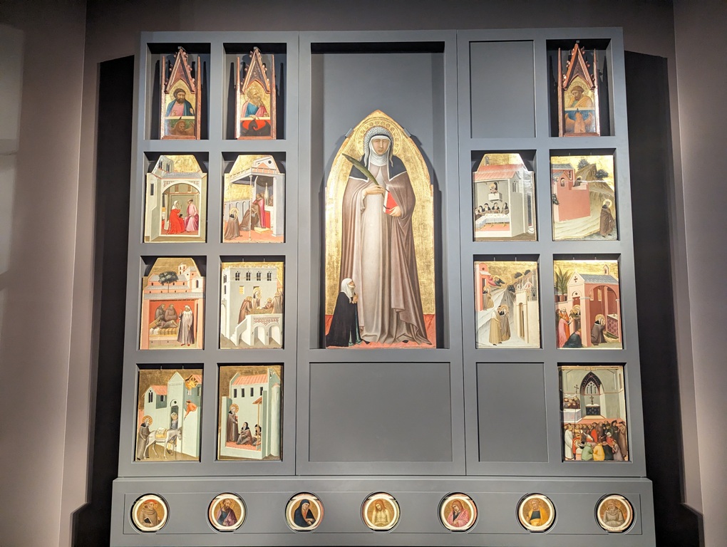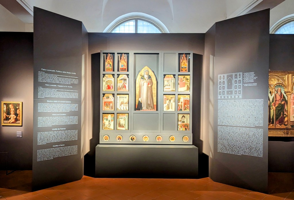 Il polittico in mostra nella Pinacoteca è composto da ben 22 elementi, tra cuspidi, predella e 11 storie che raccontano i momenti più salienti nell’esistenza di Santa Umiltà da Faenza. Umiltà (nata nel 1226 circa e morta nel 1310) fu una donna straordinaria: in contrasto con gli schemi della condizione femminile del tempo, abbracciò la vita religiosa con grande energia e spirito di iniziativa, fondò prima un monastero a Faenza e poi, a 55 anni - età venerabile per quei tempi - attraversò l’Appennino con alcune consorelle e si trasferì a Firenze per dare vita al monastero di San Giovanni Evangelista, noto come “delle donne di Faenza”. L’itinerario della santa, venerata su entrambi i versanti della montagna, si compie oggi in senso inverso con l’attuale esposizione, a suggellare l’amicizia che nei secoli ha legato la città romagnola a Firenze, e che anche durante i gloriosi anni del Rinascimento faentino ha visto i suoi signori, i Manfredi, legati ai Medici di Firenze.