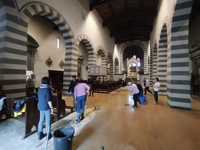 Vaiano, nella badia di San Salvatore, è entrata l’acqua coprendo il pavimento fino al primo gradino del presbiterio. Questa mattina era già defluita e il parroco don Marco Locati è stato aiutato da un nutrito numero di parrocchiani a ripulire il pavimento e le panche sporcate dal fango. Nelle prossime ore si capirà se domenica potranno essere celebrate le messe festive in chiesa e secondo il consueto orario. Altrimenti le funzioni si terranno negli spazi occupati un tempo dal circolo parrocchiale.