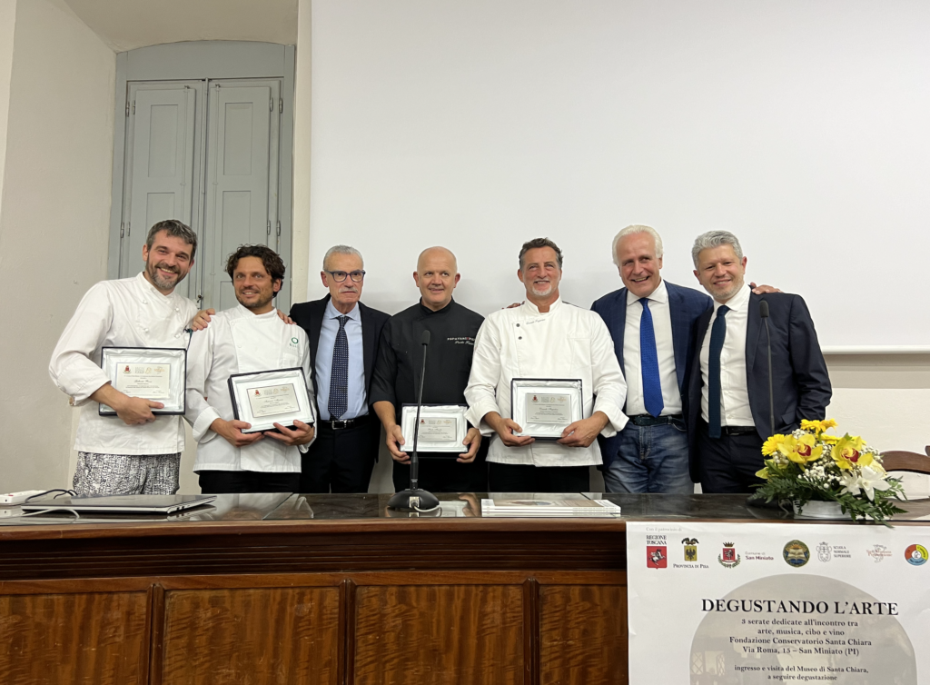 Pronto a scendere sul red carpet all'ombra della Rocca di Federico II, il tartufo si è mostrato nel suo miglior modo, ovvero a tavola. Manca ormai poco alla 52esima Mostra Mercato del Tartufo Bianco di San Miniato, in programma gli ultimi tre weekend di novembre, 11-12, 18-19 e 25-26, in tutto il centro storico. E martedì sera il fungo ipogeo per eccellenza è stato protagonista della tradizionale cena di presentazione, inizialmente rimandata dall'emergenza maltempo che si è abbattuta sulla Toscana. E proprio l'alluvione è stata ricordata dagli ospiti all'iniziativa, a partire dallo stesso presidente della Regione Eugenio Giani, tra i presenti al Conservatorio Santa Chiara come il presidente del Consiglio regionale Antonio Mazzeo, gli assessori regionali Leonardo Marras e Alessandra Nardini, il presidente della provincia di Pisa Massimiliano Angori, il presidente di Fondazione CRSM Giovanni Urti, il direttore regionale di Crédit Agricole Massimo Cerbai e il presidente della Camera di Commercio Toscana Nord-Ovest Valter Tamburini e ancora sindaci e assessori, referenti del mondo economico, associativo e imprenditoriale del comprensorio del Cuoio e non solo.