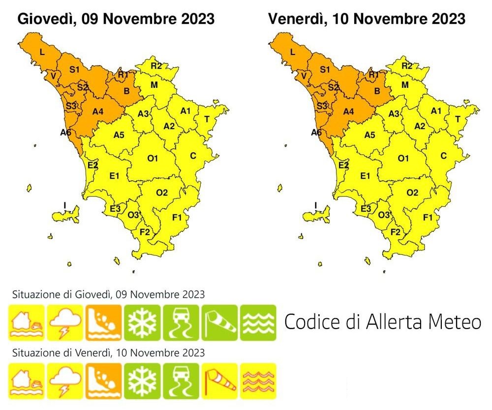 L’allerta è di codice ‘arancio’ per rischio idraulico del reticolo minore ed idrogeologico nelle aree nord-occidentali della Toscana, in particolare il Valdarno inferiore, la costa settentrionale, le Valli del Bisenzio, dell’Ombrone, del Serchio, la Garfagnana e la Lunigiana. Il codice arancio sarà in vigore dalle ore 16 di oggi, giovedì 9, alle ore 14 di domani.