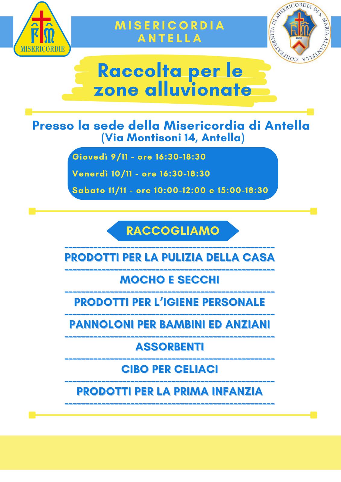 La Misericordia dell’Antella, assieme ad altre associazioni di volontariato del territorio e la Misericordia di Campi Bisenzio e il coordinamento regionale delle Misericordie, ha organizzato per i giorni 9, 10 e 11 novembre una raccolta di vari prodotti da inviare alle popolazioni delle zone alluvionate della Toscana.