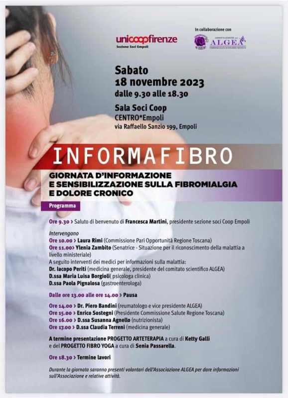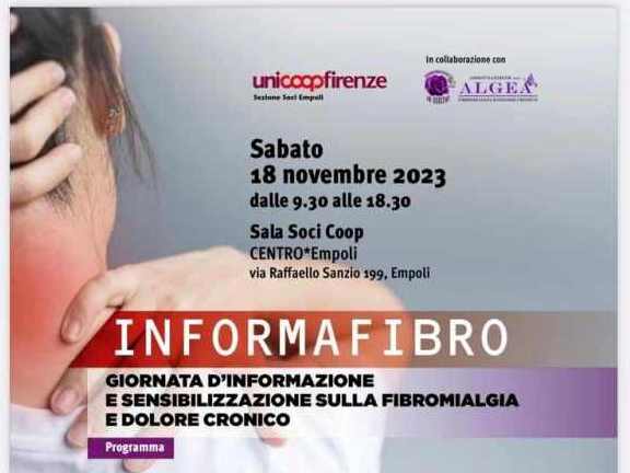 Appuntamento con l’informazione e la sensibilizzazione sulla fibromialgia e dolore cronico sabato 18 novembre, dalle 9.30 alle 18.30, presso la Sala Soci Coop - CENTRO*Empoli.