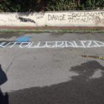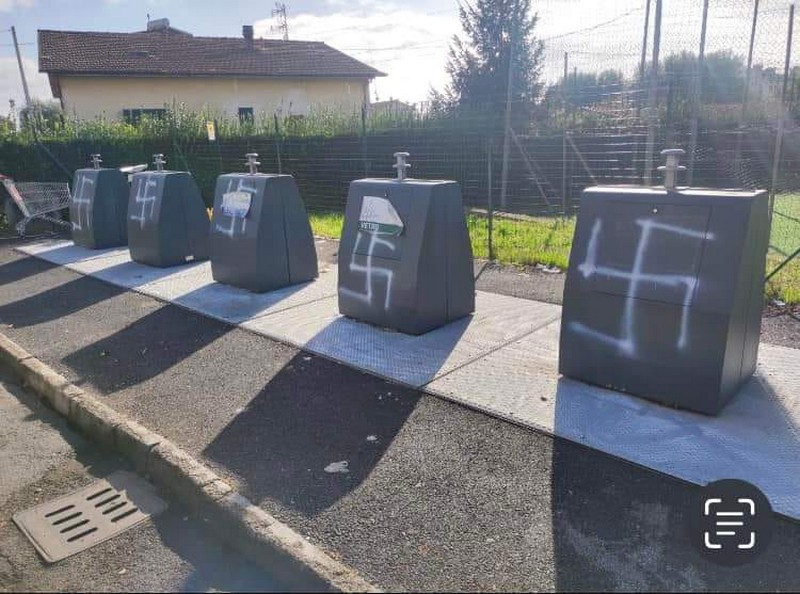 Una svastica è stata rappresentata in bianco su ognuno dei cinque bidoni, a si aggiunge una sesta svastica, in azzurro, vergata sull'asfalto sopra la scritta "Intolleranza".