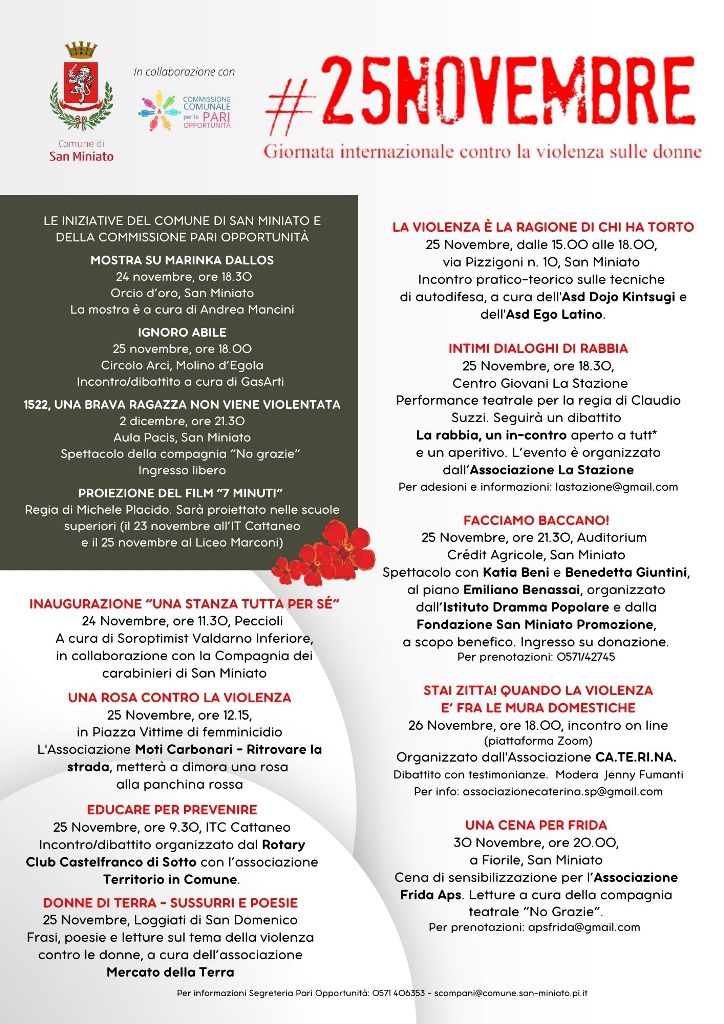 In occasione del 25 Novembre, Giornata Internazionale contro la violenza sulle donne, sul territorio di San Miniato si svolgeranno una serie di iniziative a cura del Comune, della Commissione Comunale per le Pari Opportunità e delle associazioni.