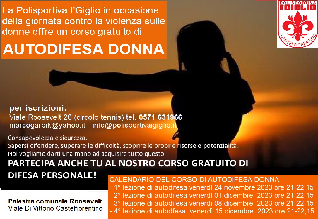 La Polisportiva I' Giglio viole partecipare a questo impegno con il suo settore Autodifesa offrendo un corso gratuito a tutte le donne di di conoscenza dell'autodifesa con 4 appuntamenti serali e precisamente: