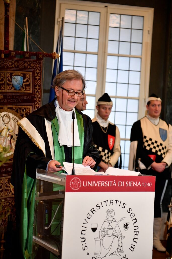 La cerimonia è stata aperta, nell’Aula Magna del palazzo del Rettorato, dal corteo accademico e il saluto dei Goliardi senesi. Il Rettore Roberto Di Pietra ha quindi preso posto insieme ai direttori dei 14 dipartimenti, ad alcuni dei docenti Delegati e al Direttore Generale Emanuele Fidora.