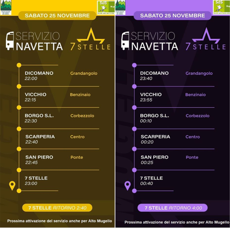 Il servizio, che sarà attivato dai prossimi eventi anche per l'Alto Mugello, è realizzato da Autolinee Toscane e gestito dalla Direzione della discoteca 7 Stelle. I biglietti, in occasione delle serate studentesche, saranno venduti presso il bar limitrofo agli Istituti superiori borghigiani, mentre in occasione di eventi speciali, potranno essere trovati nei bar aderenti.