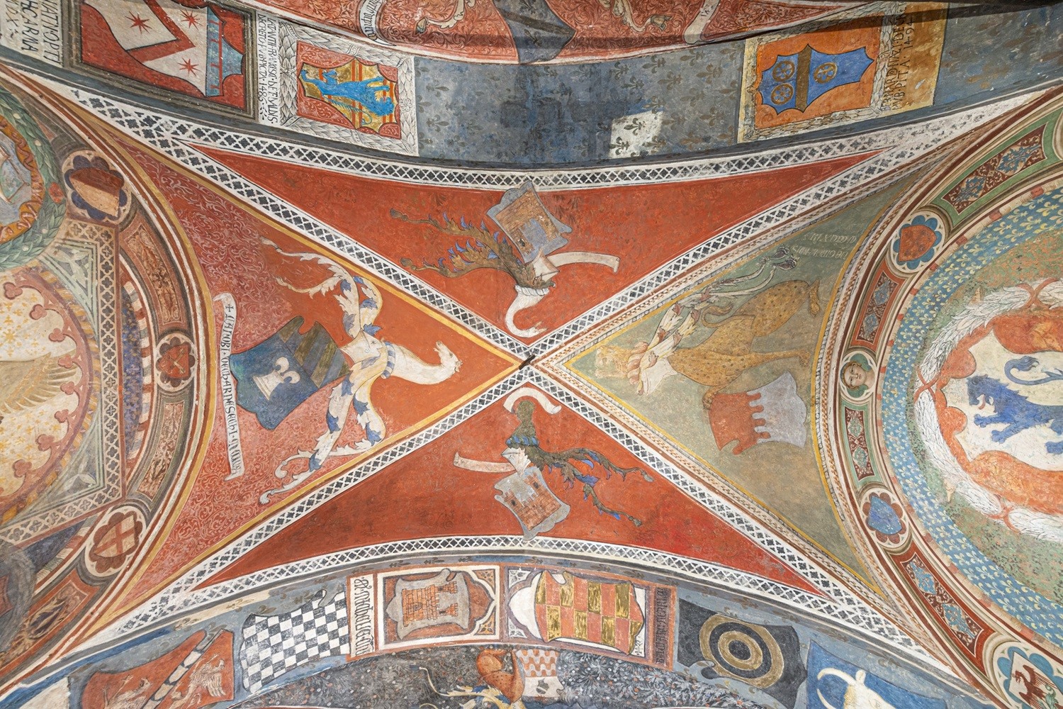 Nella Sala della Sette Virtù del Palazzo Comunale Chini lavorò nel 1897 e nel 1898 per restaurare gli affreschi medievali: stemmi e insegne araldiche apposti dai Vicari fiorentini e la Vergine che allatta il bambino circondata dalle Virtù teologali e cardinali. L’uniformità dell’apparato decorativo che oggi ammiriamo si deve alla bravura di Galileo Chini, che aveva iniziato il lavoro insieme allo zio Dario poi scomparso prima della fine del restauro. La Sala fu riportata alla bellezza originaria in un momento storico caratterizzato dall’ammirazione e dallo studio dell’arte e della cultura medioevale e dei liberi comuni. Chini si firmò in una delle specchiature a finto marmo della zoccolatura della sala. Il rapporto con San Miniato continuò negli anni successivi con altri lavori affidati all'artista.