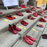 Nell’occasione, davanti gli scalini dell’edificio comunale, è stata allestita un’installazione di scarpette rosse, e le frasi lette durante la manifestazione sono state appese ad un filo davanti i loggiati del Comune.