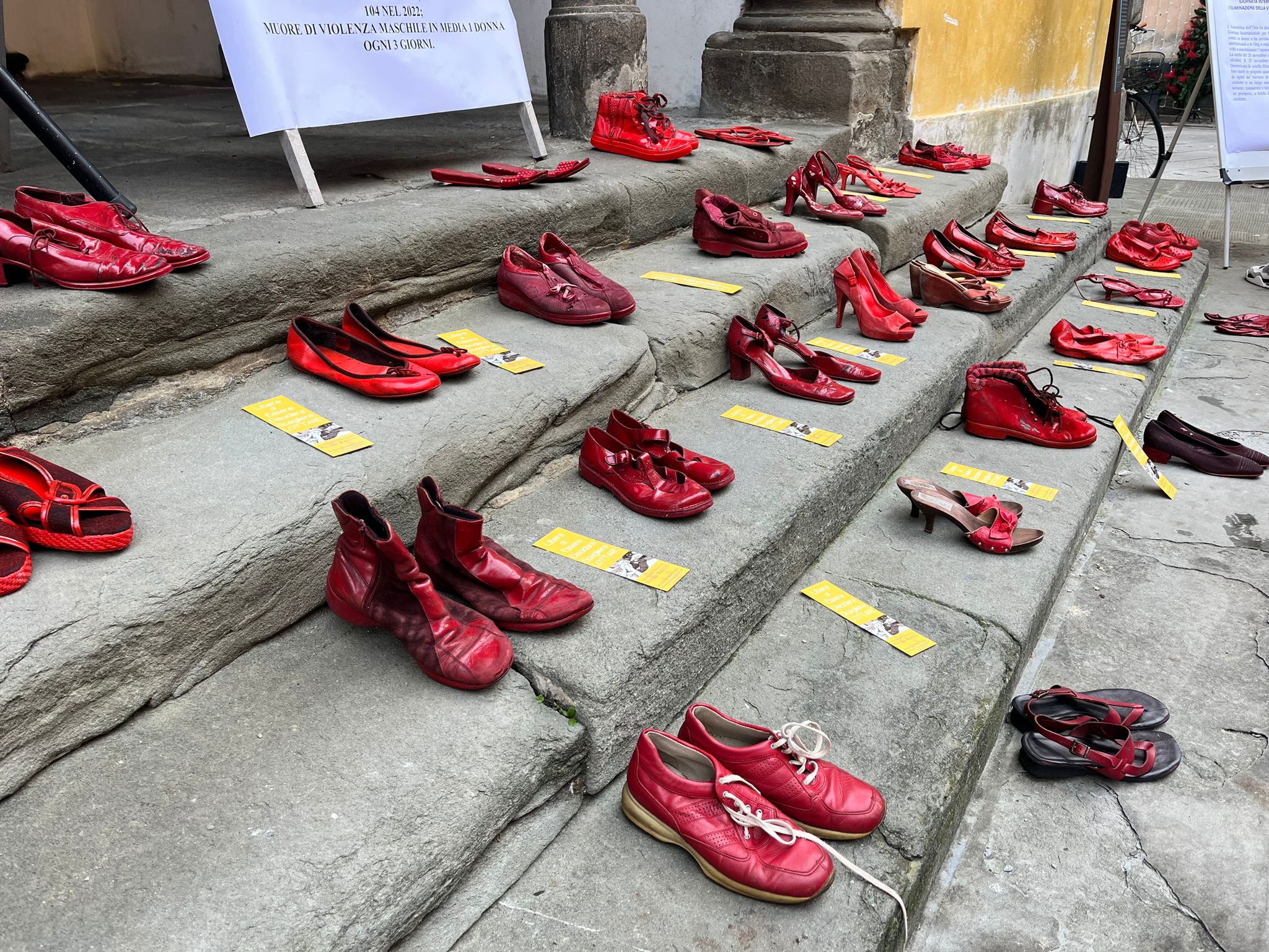 Nell’occasione, davanti gli scalini dell’edificio comunale, è stata allestita un’installazione di scarpette rosse, e le frasi lette durante la manifestazione sono state appese ad un filo davanti i loggiati del Comune.
