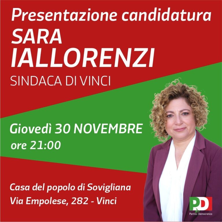 Sara Iallorenzi presenterà la sua candidatura a sindaca alle primarie del Partito democratico di Vinci giovedì 30 novembre alle 21 alla casa del Popolo di Sovigliana (via Empolese 282-Vinci).