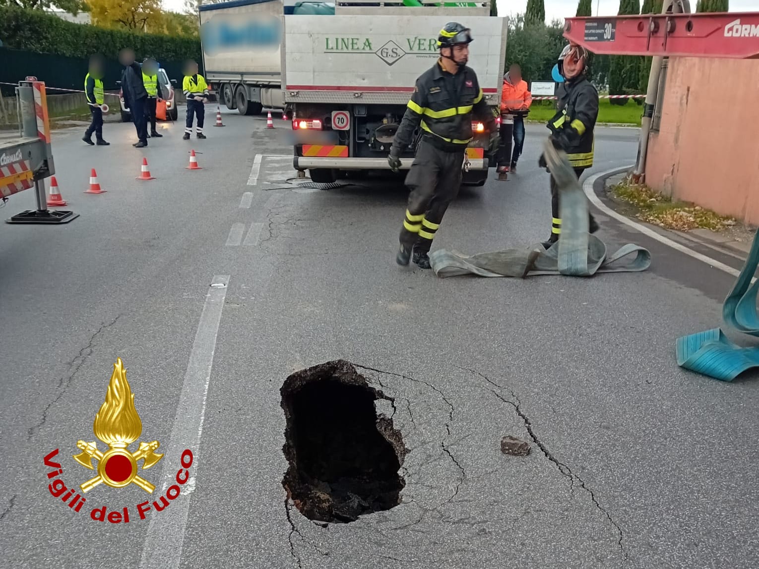 Una squadra dei Vigili del Fuoco di Pisa è intervenuta in Via Sant'Andrea, nel Comune di Santa Croce sull'Arno, a seguito di un cedimento della sede stradale. Il cedimento ha causato un incidente che ha coinvolto un camion, il quale è sprofondato con le ruote posteriori in una voragine. Utilizzando un autogru, la squadra ha proceduto alla rimozione del camion e alla messa in sicurezza dell'area colpita dal dissesto. Sul luogo dell'incidente erano presenti anche la Polizia locale e il consorzio Acquarno.