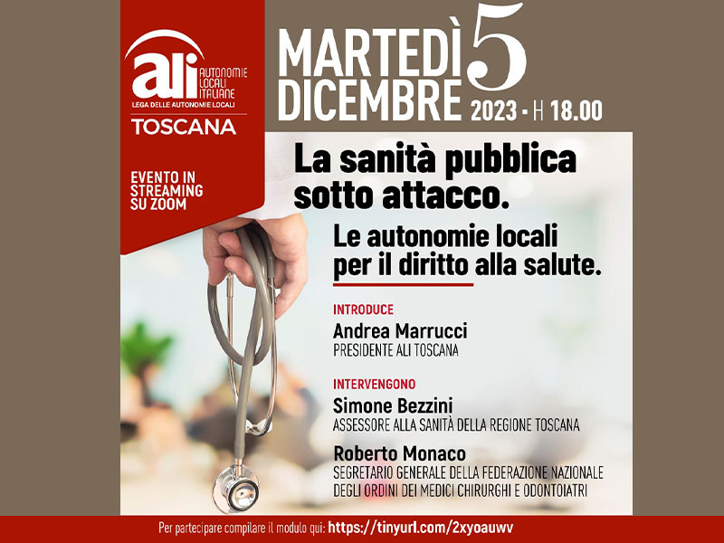 Si svolgerà il 5 dicembre via streaming, sulla piattaforma Zoom, l'appuntamento "La sanità pubblica sotto attacco". L'evento è organizzato da Ali Toscana, la lega delle autonomie locali italiane. L'inizio dell'incontro, aperto a tutti gli amministratori (obbligatoria l'iscrizione: https://tinyurl.com/2xyoauwv), è previsto per le 18. A introdurre l'incontro Andrea Marrucci, presidente di Ali Toscana e sindaco di San Gimignano. Interverranno Simone Bezzini, Assessore alla Sanità della Regione Toscana, e Roberto Monaco, segretario generale della Federazione Nazionale degli Ordini Medici Chirurghi e Odontoiatri.