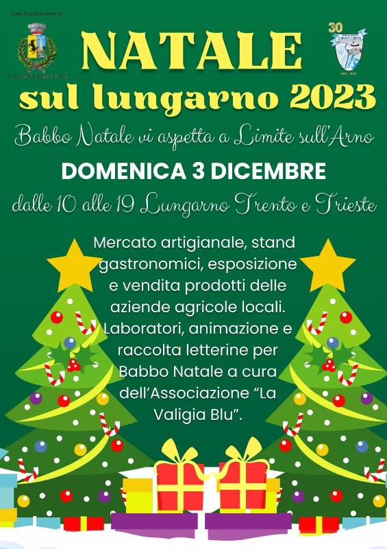 Questa Domenica 3 Dicembre l’Associazione La Valigia Blu vi aspetta a Limite sull’Arno in Lungarno Trento e Trieste all’interno della manifestazione Natale sul Lungarno 2023 organizzato dal Comune di Capraia e Limite con la Proloco di Capraia e Limite. L’intera manifestazione si svolge dalle ore 10 alle ore 19 con mercato artigianale, stand gastronomici, esposizione e vendita di prodotti delle aziende agricole locali.