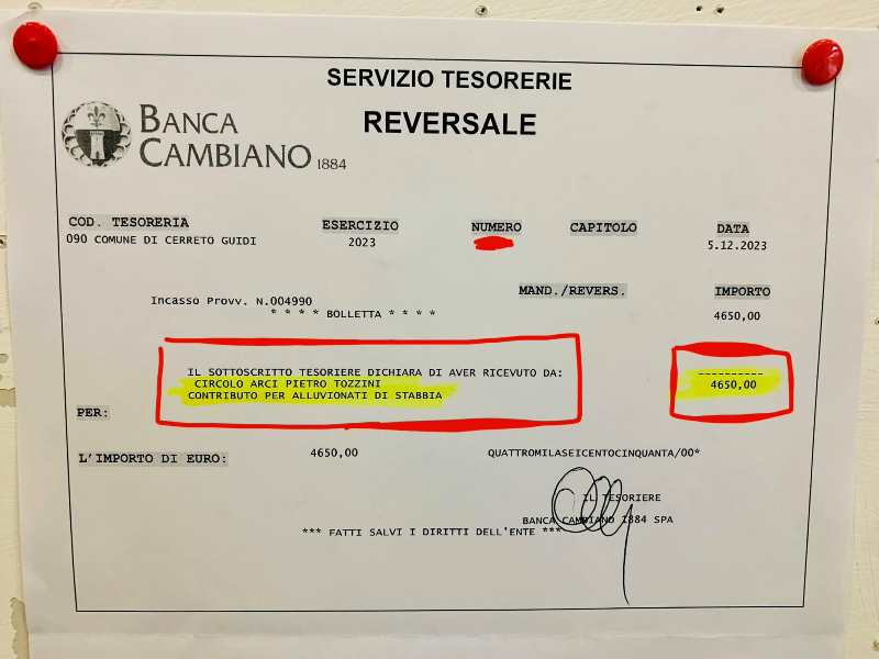 L'ultimo post in ordine cronologico mostra infatti una ricevuta che attesta la consegna alla filiale locale della Banca di una somma pari a 4650 euro da parte del Circolo Arci 'Pietro Tozzini', cioè quello di Lazzeretto.