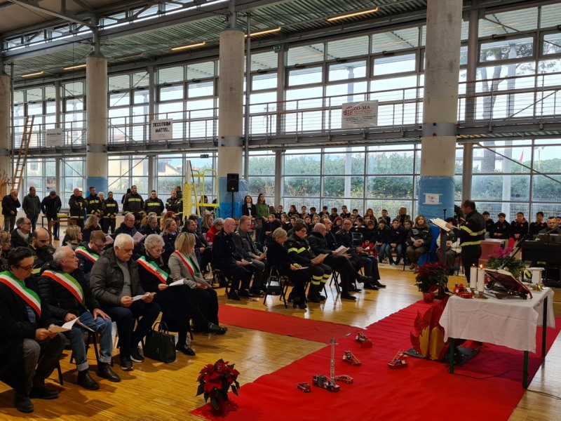 Dopo l’alzabandiera e la posa della corona ai caduti presso il Comando dei vigili del fuoco, la santa messa è stata celebrata dal vescovo mons. Nerbini e dai parroci don Szeliga e don Magherini nella palestra della scuola, addobbata grazie ai tanti lavori creati per l’occasione dai bambini, che hanno mostrato un grande entusiasmo e tanta passione per il corpo dei vigili del fuoco.
