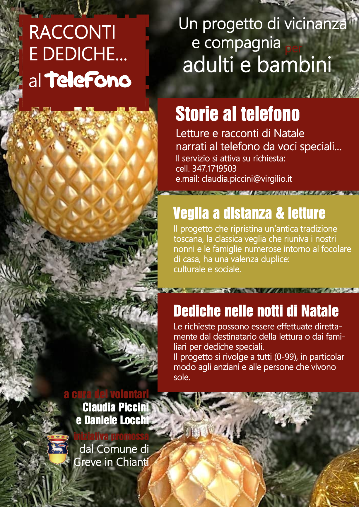 In occasione del Natale, forte del successo dell’edizione passata, il Comune di Greve in Chianti torna a scaldare i cuori con l’iniziativa "Per non perdere il filo… racconti al telefono…". C'è chi legge da una parte, in veste di appassionato divulgatore culturale e chi, dall'altra parte del filo, sente trillare il telefono, alza la cornetta e ascolta l’onda delle parole che svela storie, vite, identità, nati dalla fantasia o ispirati alla realtà, monumenti scolpiti nella letteratura classica e contemporanea di ogni tempo e latitudine. Sono i volontari Claudia Piccini e Daniele Locchi, scrittori e poeti, con l’amore per la lettura, che leggono favole e non solo con l'intento di scoprire e trasmettere emozioni semplici e genuine, condividere leggerezza e ironia travalicando ogni confine, ogni barriera fisica e sociale. Si tratta di un progetto dalla duplice valenza, culturale e sociale, nato come esperienza sperimentata con successo nella fase del lockdown e riproposto in una forma più ampia destinata ad una platea di uditori di ogni età, 0-99.