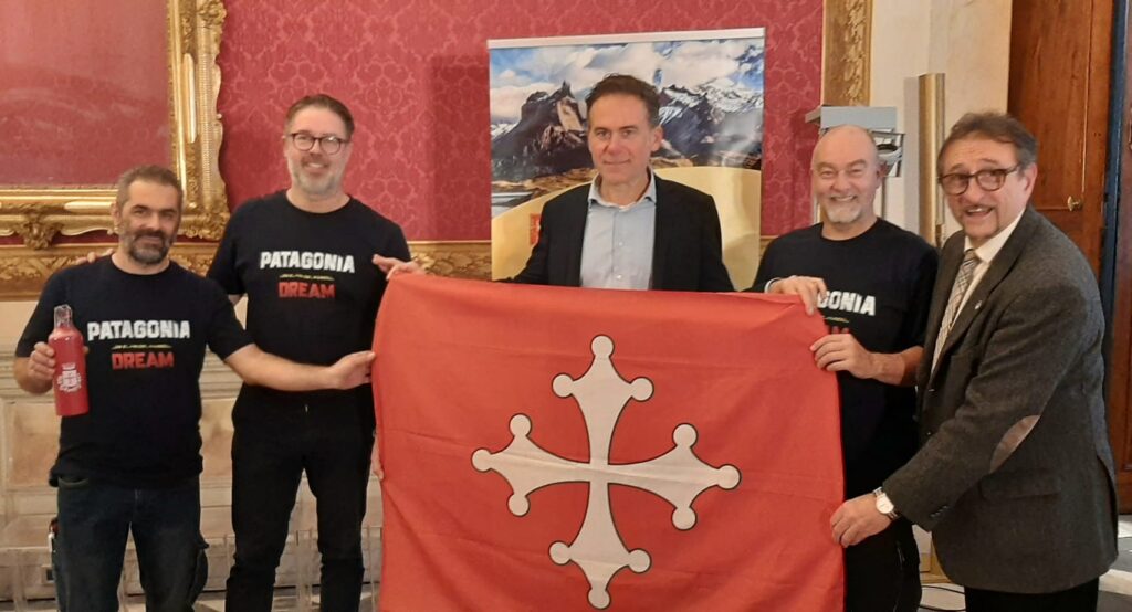 Il sindaco di Pisa, Michele Conti, ha consegnato questo pomeriggio a Michele Bini, Fausto Savini e Alessandro Giovannitti, una bandiera di Pisa perché la portino nel loro viaggio in fino alla fine del mondo. I tre pisani, infatti, si stanno preparando al viaggio, nell'ambito dell’iniziativa denominata “Patagonia Dream 2023”,. che li porterà con le loro motociclette fino a Ushuaia, nella Terra del Fuoco, oltre il famoso stretto di Magellano.