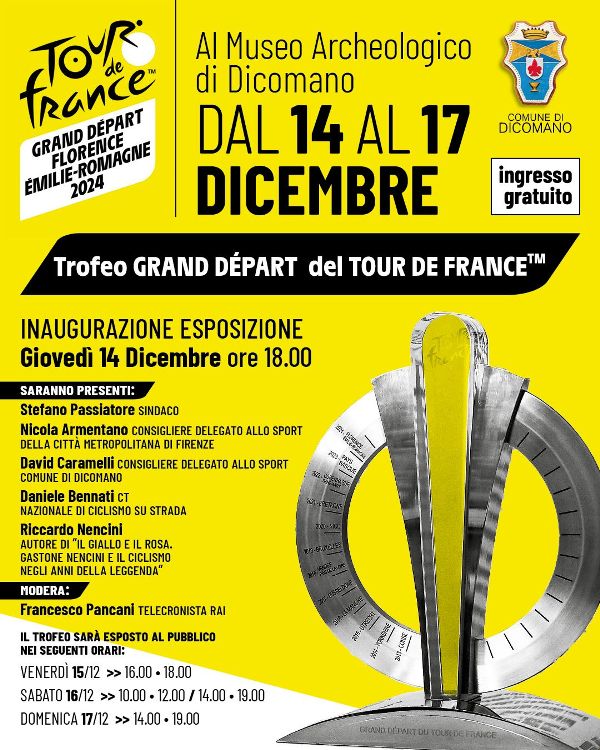 "Il passaggio del Tour de France sul nostro territorio è una straordinaria opportunità per tutta l’area – afferma il Sindaco di Dicomano Stefano Passiatore –, primo perché il Tour è seguito da oltre un miliardo di persone tra i 190 paesi in cui viene trasmesso, secondo perché per noi il ciclismo è sport storico da riscoprire e promuovere. Noi aspetteremo la tappa dando intanto l’opportunità a tutti di vedere da vicino il trofeo che il vincitore alzerà quest’anno a Nizza".