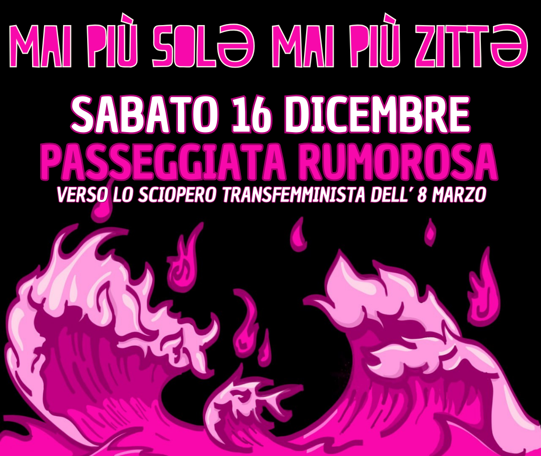 "La notizia della morte di Giulia Cecchettin non ci ha stupito, ma ha confermato quello che sapevamo già: era il femminicidio numero 107 di quest'anno (dati Osservatorio Femminicidi Lesbicidi Trans*cidi di Non Una di Meno). Per Giulia e per tutte le altre donne, trans, froc* uccisa e suicidata non siamo stata in silenzio, ma abbiamo inondato le strade con la nostra rabbia: prima nel le nostre città con decine di passeggiate arrabbiate, poi il 25 Novembre a Roma e Messina. Una marea di mezzo milione di persone e un corteo bellissimo e potente hanno strabordato in connessione con una serie di altre piazze in Italia. Abbiamo ribadito che i femminicidi, gli omolesbobitranscidi, i puttanocidi, gli stupri, le molestie, le discriminazioni non sono casi isolati, ma prodotti di un sistema di potere ben preciso e che ci riguarda tutti e tutta: il patriarcato. Ma cos'è il patriarcato? E cos'è la violenza patriarcale? Sono le botte in casa e le aggressioni per strada. Sono le invisibilizzazioni e la superficialità con cui si indaga sulle morti delle persone trans e di quelle che svolgono lavoro sessuale. Sono la vittimizzazione secondaria della polizia e dei tribunali quando denunciamo. Sono le narrazioni tossiche dei giornali che minimizzano i femminicidi come 'raptus di gelosia', 'non potevo vivere senza di lei' o 'non reggevo più a sentirla soffrire'. Sono i tagli alla spesa pubblica che rendono le nostre esistenze sempre più precarie, ricattabili e violentabili. Sono gli sgomberi di spazi transfemministi, di consultori e Centri Anti Violenza. Sono le misure del pacchetto sicurezza proposto dal governo Meloni, ricette securitarie e razziste che aggravano drammaticamente il quadro. Sono i tagli del 70% alla prevenzione della violenza di genere che il governo ha attuato in questo ultimo anno. Violenza patriarcale è una proposta di legge di Provita e Famiglia che ha raccolto più di 100.000 firme e che vorrebbe costringere chi deve interrompere la gravidanza ad ascoltare il battito fetale. La guerra sui corpi corre parallela a quella sui territori. Per questo molti nodi di Non Una di Meno scenderanno in piazza il 16 a Carrara per la manifestazione "Le montagne non ricrescono - fermiamo l'estrattivismo in Apuane e ovunque". L'estrattivismo brutale è diventato strumento di un capitalismo patriarcale e predatorio che mette a profitto le vite e i territori. li 17 dicembre è la Giornata Mondiale contro la violenza sulle persone che svolgono lavoro sessuale e in tutto il weekend saremo insieme nelle piazze e nelle strade, perché il lavoro sessuale è lavoro e le continue violenze e discriminazioni che subiscono la sex worker sia sul piano delle tutele inesistenti a livello lavorativo, sia sul piano dello stigma sociale è ancora altissimo, sono una delle tante facce della violenza strutturale che ci opprime. Insieme puntiamo il dito, perché sappiamo chi sono gli assassini, gli stupratori e i violenti: la chiesa, i giudici, la polizia, "il presidente", "i bravi ragazzi". Unit* rifiutiamo un sistema che ci uccide, ci stupra, ci impoverisce. Insieme urliamo e organizziamo la nostra rabbia. Lo facciamo ogni settimana, da otto anni, nelle assemblee territoriali di Non Una di Meno e ci sosteniamo a vicenda giorno dopo giorno. Unita organizziamo lo sciopero globale transfemminista dell'S Marzo per dimostrare nuovamente che le nostre vite valgono, e che se ci fermiamo noi, si ferma il mondo! Contro la violenza maschile e di genere, contro la violenza patriarcale: "Mai più sol* e mai più zitt*"