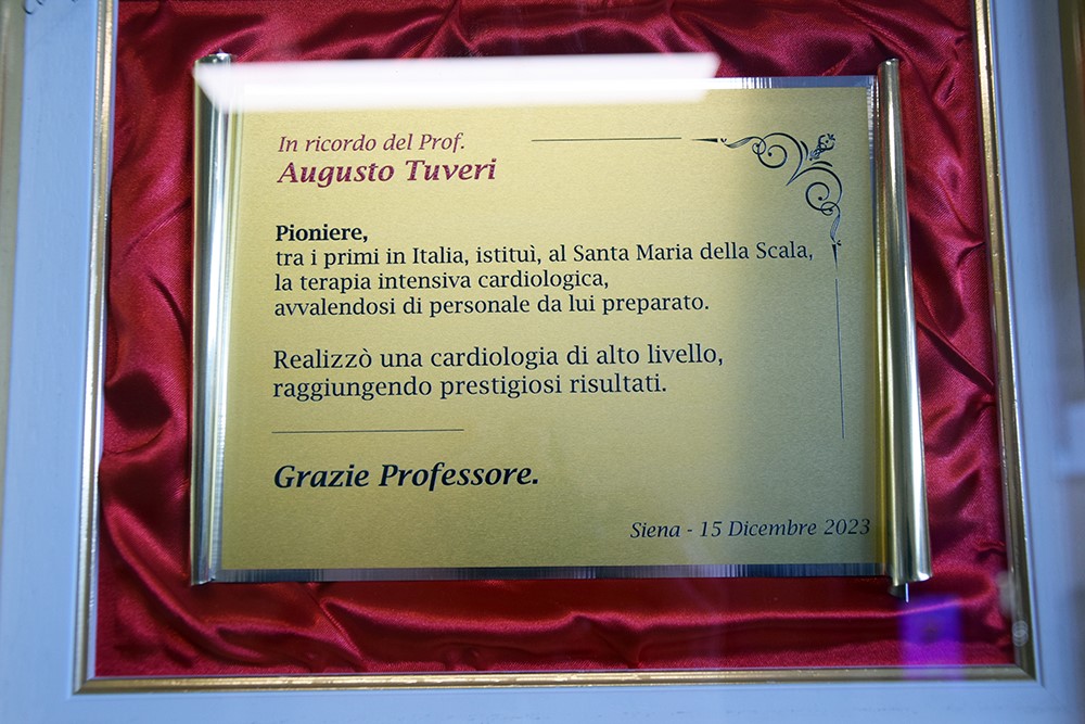 Una targa in memoria del professor Augusto Tuveri, riferimento per la Cardiologia senese, su iniziativa del personale, tra cui diverse infermiere e colleghi in pensione, che hanno condiviso con lui importanti esperienze professionali ed umane prima al Santa Maria della Scala e poi al policlinico Santa Maria alle Scotte. È quella inaugurata all’ingresso del reparto di Cardiologia dell’Azienda ospedaliero-universitaria Senese, diretto dalla professoressa Serafina Valente e situato al lotto 3 piano 3. Durante la cerimonia il dottor Roberto Favilli, già direttore della Cardiologia, ha ricordato le grandi qualità del professor Tuveri, ovvero “passione, dedizione, perseveranza, cultura scientifica, medica e particolare attenzione alle innovazioni tecnologiche”, insieme ad un ricordo particolarmente sentito di alcune infermiere, che hanno raccontato con emozione e commozione la figura del professionista e dell’uomo che tanto ha contribuito nel suo ruolo in ambito di didattica, ricerca ed assistenza per la formazione dei giovani medici ed infermieri e per la cura dei pazienti. Hanno partecipato il professor Antonio Barretta, direttore generale dell’Aou Senese, la dottoressa Francesca Cesareo della Cardiologia, la famiglia e le ex colleghe e gli ex colleghi del professor Tuveri.