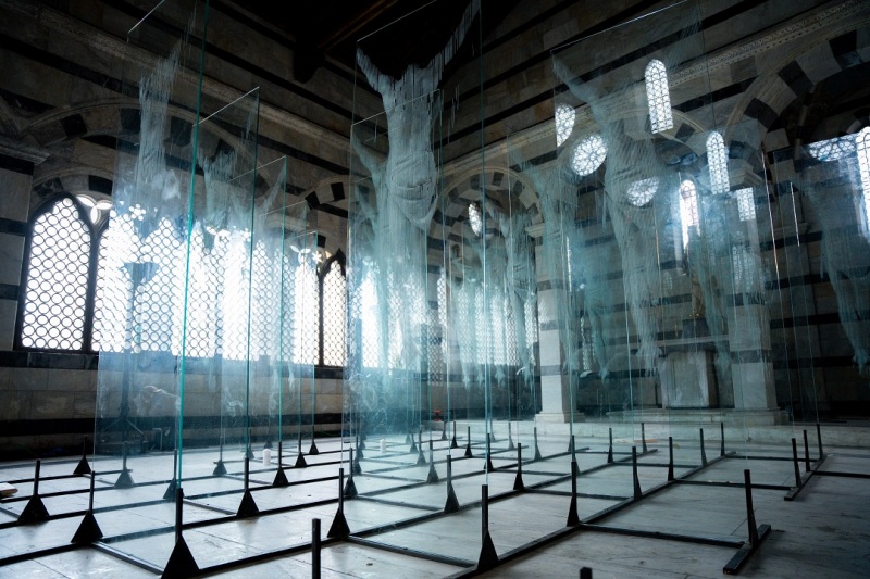 In parallelo, sempre sul Lungarno Gambacorti, nella Chiesa della Spina è possibile ammirare l’installazione "Non Plus Ultra", di Gonzalo Borondo, artista spagnolo classe 1989 che dal 2007 interviene nello spazio pubblico sviluppando un linguaggio originale, in connessione con il luogo d’azione e la percezione fisica e simbolica degli spazi. L’installazione pisana, anche in questo caso visibile fino al 7 gennaio, si ricollega alla spiritualità della Chiesa, innescando una riflessione esistenzialista più che religiosa attraverso 35 lastre di vetro stampate, ciascuna delle quali ospita due immagini grafico pittoriche: una colonna e una figura di spalle con le braccia distese, che rimanda all’iconografia della crocifissione. Un labirinto trasparente di segni e simboli per riflettere sul concetto di limite, sulla sua negazione, sul bisogno sacro dell’uomo di varcare la soglia del conosciuto e della logica, di superarsi e proiettarsi all’infinito.