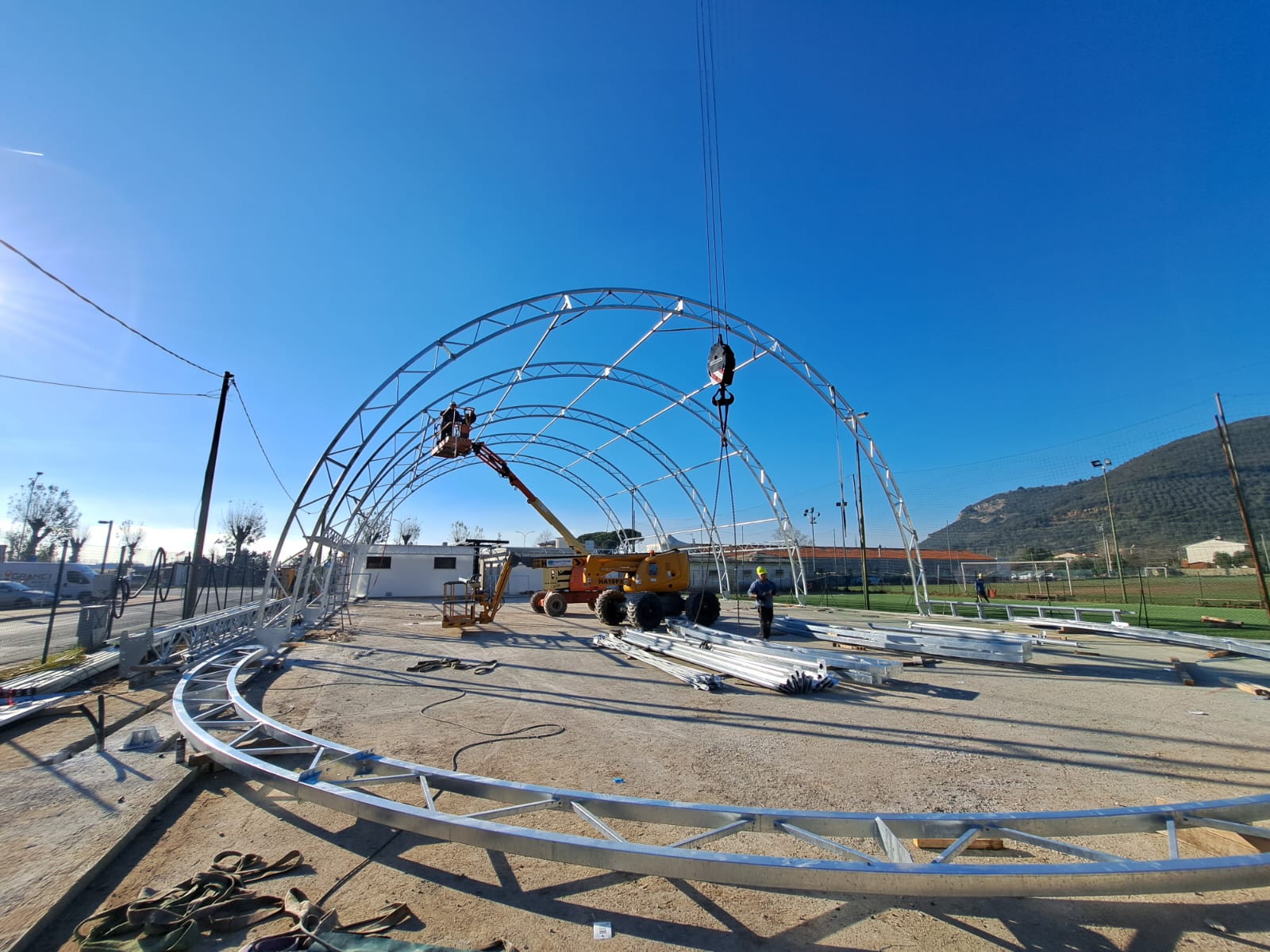 Sopralluogo dell'Amministrazione comunale di San Giuliano Terme ai lavori al 'pallone' di Asciano Pisano che sono arrivati ad un punto importante con il montaggio della struttura di copertura del campo. L'assessora allo sport Roberta Paolicchi ha visitato il cantiere dove sta sorgendo il manufatto che andrà ad ospitare attività sportive e sociali.